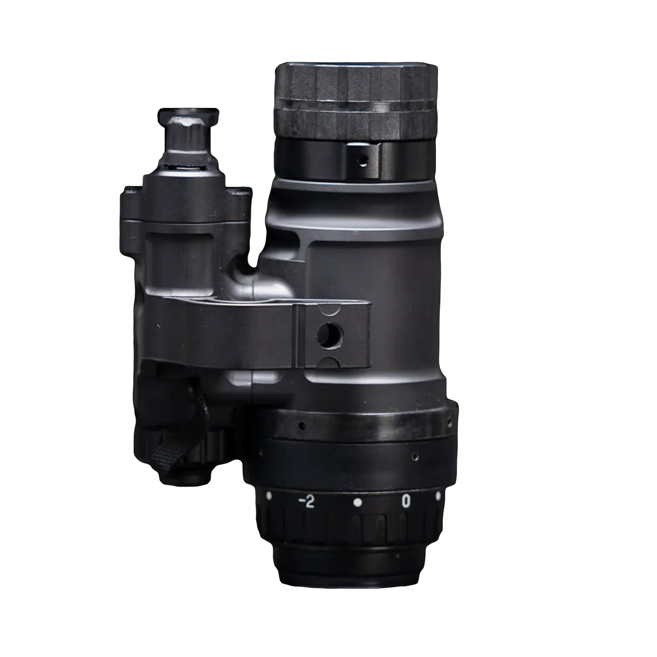 This system is built around versatility and endurance. It features manual gain control compatible with both 11769 and 3-pad image intensifier tubes, allowing precise image tuning in dynamic lighting conditions. The MH-14 integrates dual IR illuminators: a low-power option for close-in tasks such as map reading, and a high-power spot for extended illumination. Power is supplied by a single, easily sourced AA battery providing over 50 hours of continuous operation.